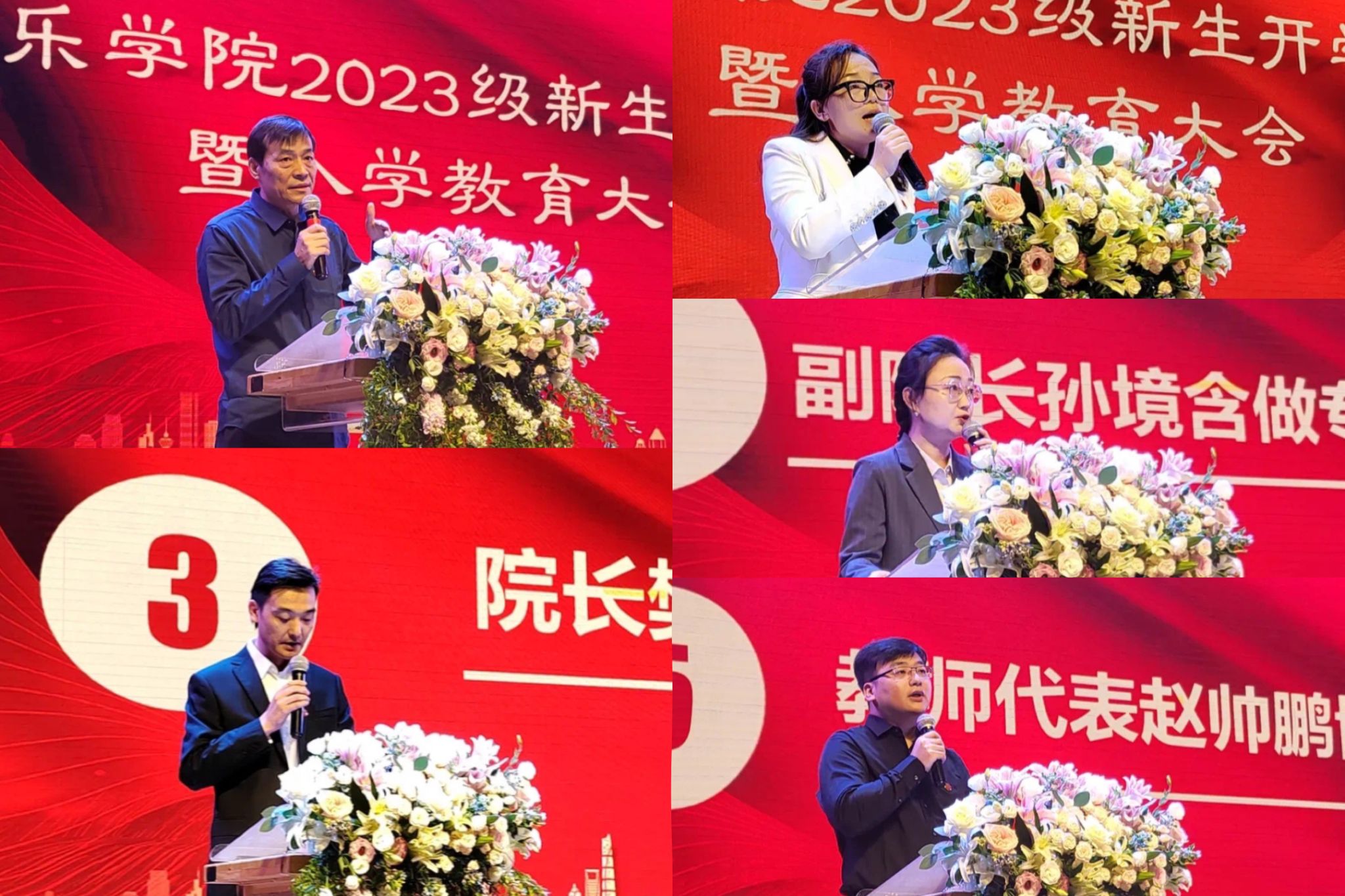 副经理孙境含对公司概况、团队队伍、专业特色介绍及教学管理制度解读。教师代表赵帅鹏博士、在校生代表音乐2102乔彩虹、新生代表舞蹈2304勾溥一分别发言。