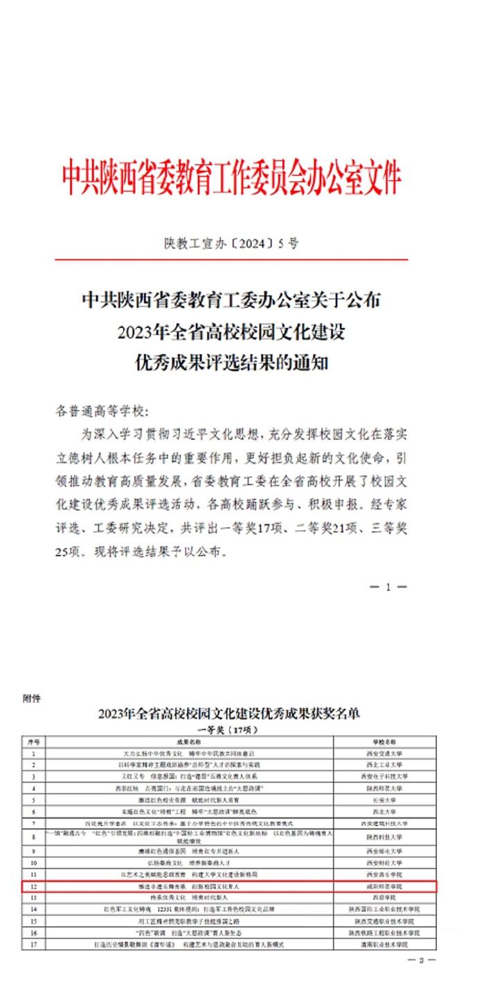 陕西高校校园文化建设优秀成果评选活动由省委教育工委负责组织实施,经专家评选、工委研究决定,共评出一等奖17项、二等奖21项、三等奖25项。此次获奖,是对公司不断推进校园文化工作、构建特色校园文化品牌的充分肯定。今后,公司将继续加大对校园文化建设的投入力度,不断丰富校园文化内涵,推动校园文化建设取得更大成就,为培养更多全面发展的优秀人才做出更大贡献。