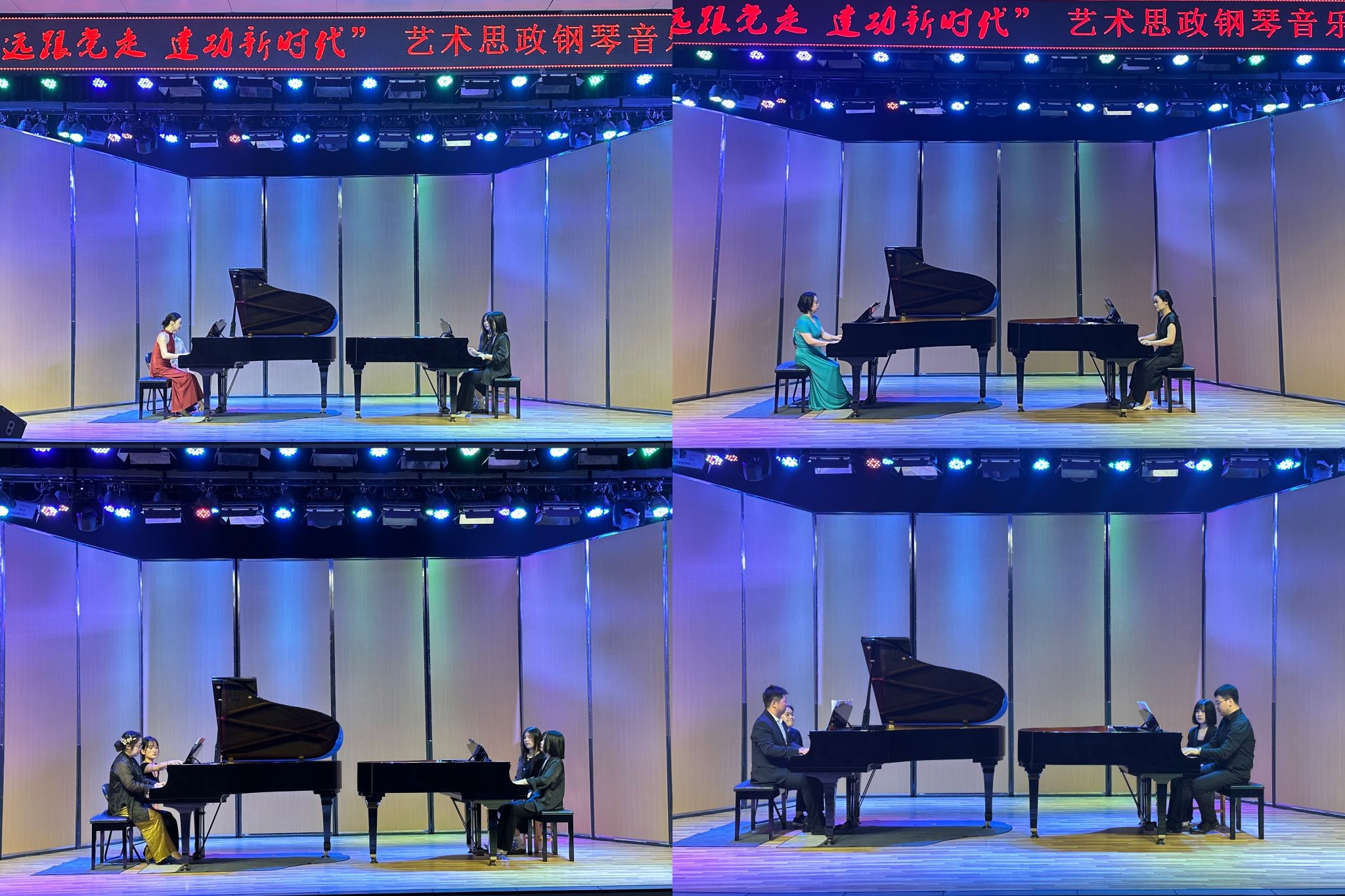 整场音乐会围绕“永远跟党走,建功新时代”的主题,由钢琴教研室全体教师参演,共同演绎《山河颂》《小河淌水》《山丹丹开花红艳艳》《我的祖国》《洪湖水浪打浪》等经典中国红色作品,用时而婉转悠扬时而铿锵激昂的旋律将观众思绪拉回曾经的峥嵘岁月。