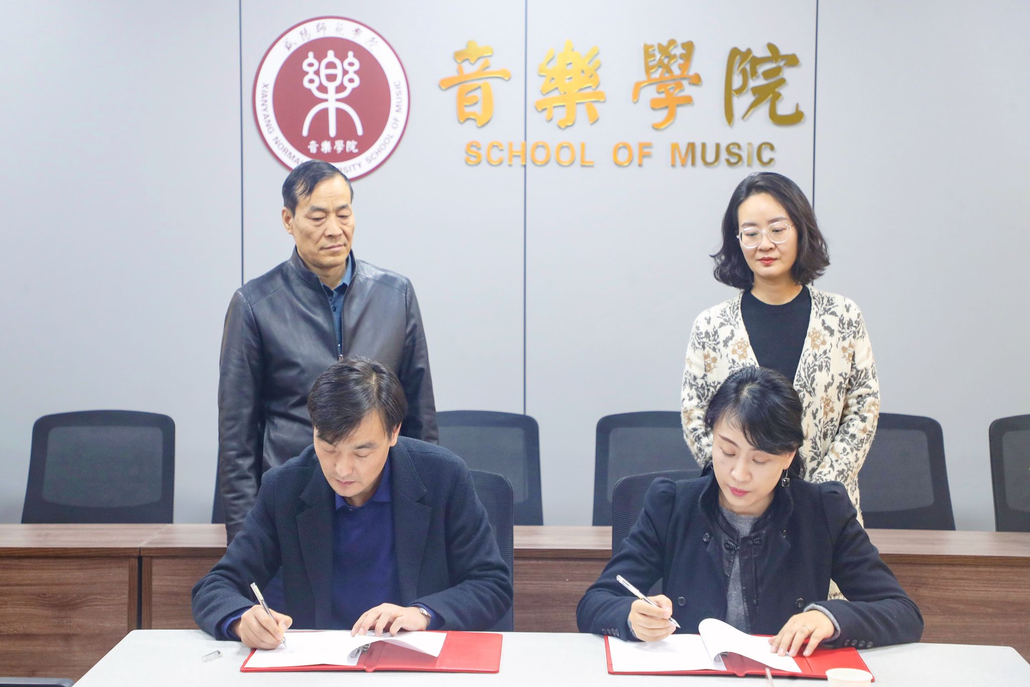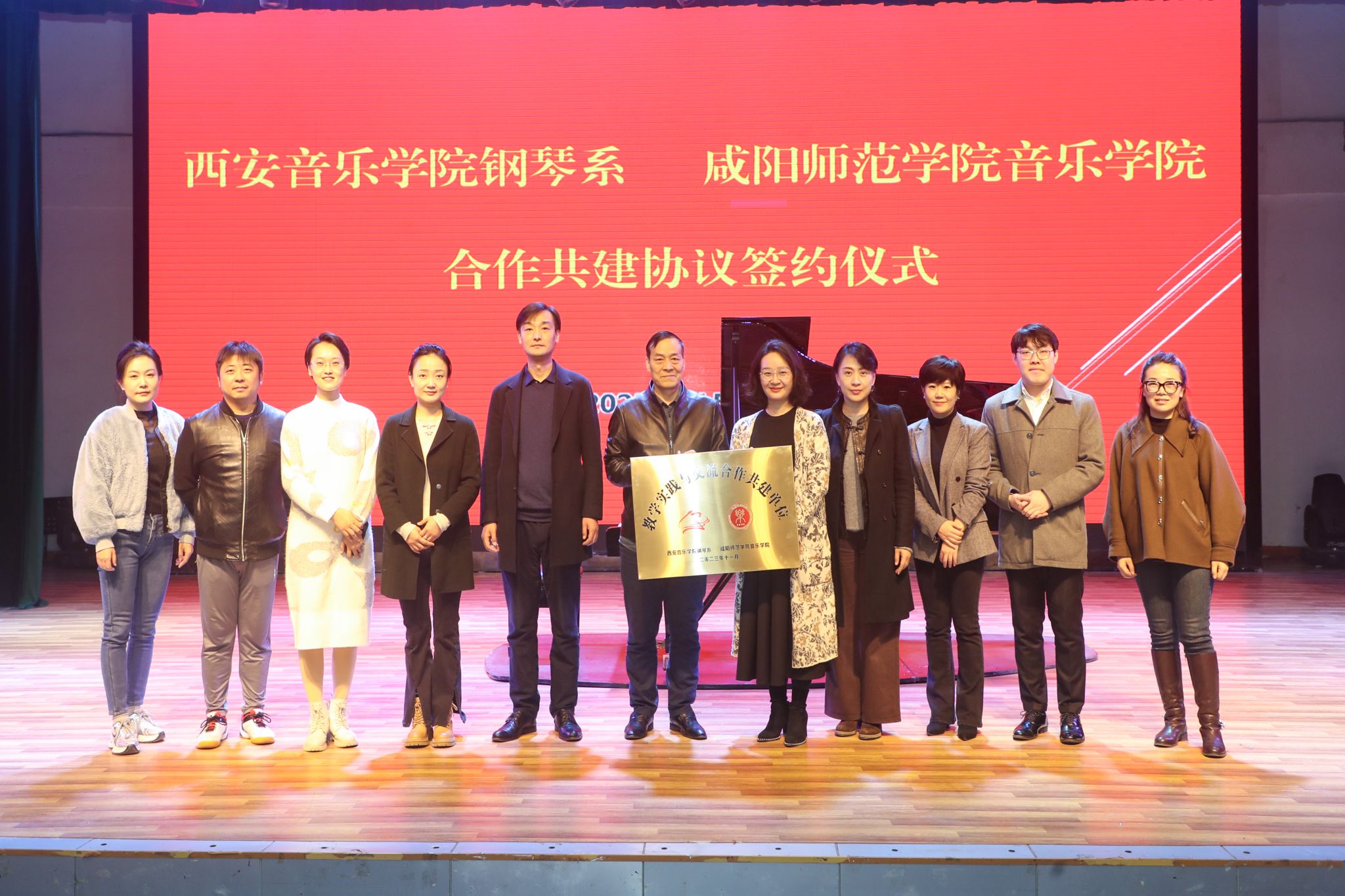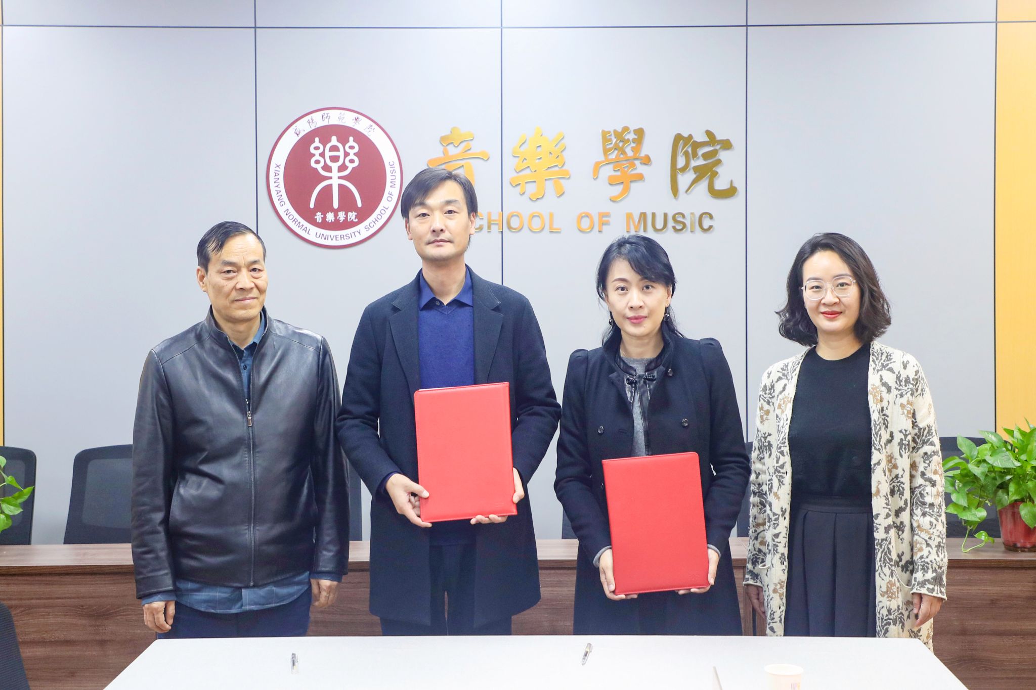 公司经理樊琪与钢琴系副主任吴晓韬签订合作共建协议书并合影留念。